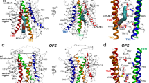 A comparison of the three-dimensional reconstructions of both datasets revealed an additional density for GLMP–MFSD1His–Ala (Fig. 6d) in the cavity between the two helical bundles (Fig. 6c). This potential binding site is located approximately halfway into the membrane-spanning region and is formed by TM1 (Tyr56 and Tyr59), TM4 (Glu150) and TM5 (Gln176 and Arg181) of the N-domain and TM7 (Tyr276 and Phe280), TM10 (Tyr365 and Trp373) and TM11 (Gln393, Gln396, Asn397 and Leu400) of the C-domain (Fig. 6d). The cavity exhibits a bipolar surface character mainly caused by residues Glu150 and Arg181(Fig. 6e).