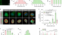 AFM force spectroscopy measurements were performed using JPK NanoWizard 2 (Bruker Nano) mounted on a Nikon Eclipse Ti inverted microscope and operated with JPK SPM Control Software v5. Measurements were performed at 37 °C. Triangular non-conductive silicon nitride cantilevers (MLCT, Bruker) with a nominal spring constant of 0.01 N m−1 were used for force spectroscopy measurements with the probe tip positioned directly over the nucleus. For all indentations, forces of up to 3 nN were applied and the velocity of indentation was kept constant at 2 µm s−1. Force maps of 4 µm2 with resolution 2 × 2 pixels were used to perform technical replicates of nuclei indentation, and all valid curves were analysed. Before fitting the Hertz model to obtain Young’s Modulus (Poisson’s ratio of 0.5), the offset was removed from the baseline signal, the contact point was identified and cantilever bending was subtracted from each force curve. All analysis was performed with JPK Data Processing Software (Bruker).