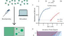 Recombinant GFP or mCherry fusion proteins were first diluted and equilibrated in a specific salt concentration by adding NaCl or droplet formation buffer (10 mM Tris−HCl pH 7.5, 5% glycerol and 0.1% NP-40), followed by a 10-min 17,200g centrifugation at 4 °C to remove any insoluble proteins formed during the freeze−thaw process. The proteins were then mixed at appropriate concentrations and promptly loaded into a custom-made chamber, which consisted of a glass slide sealed with a coverslip using two parallel strips of double-sided tape. For droplet formation experiments in alternative buffers, the indicated protein amounts were mixed to achieve the final buffer concentration. Alternative buffers included transcription buffer (20 mM Na−HEPES, pH 7.4, 130 mM NaCl, 3 mM MgCl2, 4% (v/v) glycerol, 1 mM DTT and 1 mM rNTPs) and pull-down/immunoprecipitation buffer (10 mM Tris−HCl, pH 7.5, 0.2 M NaCl, 0.2% NP-40, 10% glycerol and 1 mM β-mercaptoethanol). The samples were then loaded into imaging chambers and visualized. Imaging was performed using a Zeiss AXIO epifluorescence microscope or Zeiss LSM800 confocal microscope with a 63× oil objective. Images typically show droplets settled on the glass coverslip under 100 mM NaCl conditions. For the sedimentation assay, each reaction had a typical final volume of 100 μl. After a 10-min equilibration at room temperature (22 °C), protein samples were centrifuged at 17,200g for 10 min at 22 °C using a tabletop temperature-controlled microcentrifuge. Post-centrifugation, the supernatant and pellet were promptly separated into two tubes. The pellet was thoroughly resuspended in the same buffer to match the volume of the supernatant. Proteins from both fractions were denatured and analysed on 8% SDS−PAGE stained with Coomassie blue. Band intensities were quantified using ImageJ software. To assess condensate formation at different temperatures, proteins were mixed at a final concentration of 1 μM and incubated for 10 min at 4 °C, 25 °C or 37 °C. Samples were then loaded onto CELLview cell culture dishes and imaged using an internal reflection fluorescence microscope (DMi8 TIRF, Leica) at corresponding chamber temperatures of 25 °C (for both 4 °C and 25 °C pre-incubated samples) and 37 °C (for the 37 °C sample).