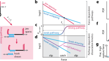 Design requirement III is the most challenging to achieve. It requires that the interconversion EIC is more susceptible to tension than the dissociation barrier from state 1 (E1). We accomplish this by using stress localization based on the mechanical geometry of loading. The crosslink (barrier E1) is loaded in a shear-type configuration, where the tension is distributed evenly across all base pairs. By contrast, the hairpin (barrier EIC) is loaded in a zipper-type geometry; this localizes the tension on the first few base pairs at the start of the hairpin. This stress localization makes DNA duplexes loaded in a zip geometry mechanically unstable as compared to identical duplexes loaded in the shear geometry. This difference in mechanical stability between zip-loaded and shear-loaded DNA duplexes has been widely established in a range of studies38,53,54,55,56. It has been exploited previously to create DNA molecular motors relying on asymmetric binding sites that respond differently depending on the direction of the applied force45. Our DNA catch bond differs from this mechanism, as it strengthens under increasing force applied along a single direction. Furthermore, the difference between shear-type and zip-type unfolding pathways has been proposed previously as a mechanism for catch-bond behaviour in natural proteins too57,58. Requirements II and III ensure that dissociation of the weak crosslink is more likely at low tension, and opening of the hairpin followed by interconversion to the strong state is more likely at high tension. This force-dependent stability switching of the crosslink versus the hairpin lies at the core of our DNA catch-bond design.