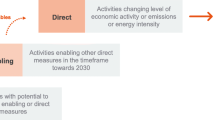 In the equation, subscripts i and r represent sector and country/region, respectively. The superscript t stands for year. Values for \({\mathrm{output}}_{ir}^t\) are collected from the above economic impact model. The value \({\mathrm{intensity}}_{ir}^t\) refers to per output emissions. The historical emissions are collected from the IEA66. The emission intensities are collected from IIASA’s GAINS model37 and IEA38,39 (see Scenarios of fiscal stimuli).