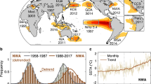 Consistently, using mean warming-inclusive thresholds, we find that the mean intensity in LMEs increases by more than 100%, from 1.2 °C during the historical period to 2.9 °C by the end of the century. As expected, the mean intensity over the LMEs based on future thresholds yields a small increase of 0.2 °C. Despite this, 93% of LMEs display an increase in intensity (Fig. 5b). The increase is contributed primarily by the changes in the SST variance, reflected by a statistically significant correlation (P < 0.05) between MHW intensity and SST variance in both historical and future periods (Extended Data Fig. 6). Given the vast diversity of geographical locations of the LMEs, forcing of the increased SST variance is equally diverse. Under greenhouse warming, dominant modes of climate variability, which strongly influence MHWs across the global ocean, are generally projected to increase in their variance. As such, there is increased SST variance, hence an increased intensity of MHWs over a majority of the LMEs, at least in part attributable to strengthened El Niño/Southern Oscillation variability48, enhanced SST variability over the north tropical Atlantic49, increased frequency of stronger positive Indian Ocean Dipole50 and a stronger nonlinear relationship between evaporation and SST over the North Pacific51 under greenhouse warming.