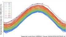 where \(\varDelta T(m,x,t)\) is the temperature change simulated by the mth model in the ensemble, for the spatial domain x at time t. Parameter \(E(m,t)\) is the diagnostic value of the cumulative CO2 emissions (calculated as the sum of the annual changes in atmospheric CO2 concentration and the CO2 uptake by ocean and land carbon sinks) of the model.