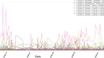 We fitted ARIMA with up to four Fourier components (see ‘Eigengenes and their analysis’ section), while the parameters P, d and q were automatically optimized by the function, leading to five ARIMA models (one for each increment of Fourier transform terms, starting with 0). For the Prophet modelling, we specified seasonality (period = ‘year’, type = ‘additive’ and order = from 0 to 4, analogously to the Fourier transform terms of the ARIMA) and growth (type = ‘logistic’), resulting in five Prophet models. The neural network function was used whereby the number of nodes in the hidden layer was set to 10, 20 and 30. The 13 models for each signal were scored according to their RMSE, and the 3 models with the lowest RMSE were combined (weighted by 1 – RMSE), as a 14th ensemble model. The RMSE was calculated for the 14 models as well (Extended Data Fig. 9). For each signal, the model with the lowest RMSE was selected for the putative generative process and used to forecast the test set with the function ‘forecast’ of the fable package and supplying environmental parameter readings.