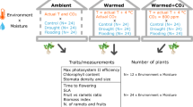 Ongoing drastic increases in atmospheric CO2 concentrations (subsequently [CO2]) and the resulting changes in global temperatures and drought severity are altering our environment1. Dissecting whether and how plants respond to this will be key to understanding plants’ potential for adaptation to climate change, and to developing strategies to increase their chances of survival. Several phenotypic trends observed in large numbers of plant species and across continents are being reported, including the acceleration of flowering2,3 and other life history events4, the increase in photosynthesis5 and the decrease in the number of stomatal pores in plant leaves6. However, it has thus far been difficult to resolve whether these trends reflect plastic phenotypic changes or result from evolutionary genetic change7. Stomata are one of the plant structures that are most directly relevant to multifactorial climatic changes, as these surface pores, essential for survival and productivity, are major contributors to plants’ water-use efficiency (WUE): the ratio between CO2 uptake for photosynthesis (A) and the release of O2 and loss of water vapour with transpiration (E; reviewed in ref. 8). Optimizing WUE to environmental conditions can improve plant fitness and yield when plant growth and cooling through transpiration are balanced with minimal water loss. WUE is partially fine-tuned through variation in stomatal size and density (that is, the amount of stomata per plant surface area9,10,11). This stomatal variation can represent temporary plastic responses or result from evolutionary genetic change over generations that produces local adaptation12,13,14.