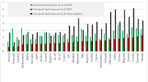 The effect of a change in the tax on the equilibrium price can then be found by treating the price as a function of the tax, differentiating the equilibrium condition fully with respect to the tax, solving for the derivative of the price with respect to the tax and rewriting. Let x denote the share of global demand for oil that comes from road fuel demand in the EU and let y denote Russia’s share of the global oil supply. The market response to a change in the tax depends on the supply and demand elasticities in the submarkets. Let \(\tilde \varepsilon _{D,{\rm{EU}}}\), \(\varepsilon _{D,{\rm{ROW}}}\), \(\varepsilon _{S,{\rm{RU}}}\) and \(\varepsilon _{S,{\rm{ROW}}}\) denote the demand elasticities in the EU and the rest of the world and the supply elasticities of Russia and the rest of the world, respectively. The demand elasticity for the EU measures the response in demanded quantities of oil to changes in the end user prices, including additional costs and taxes, while the other elasticities measure responses of quantities of oil to changes in the oil price. Using this notation, the effect of a tax change on the oil price is given by the derivative