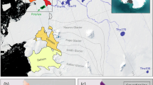 Subglacial routing and catchments were determined using hydropotential gradients6 and followed the stochastic D8 method described previously45. This allowed probability to be quantified using a Monte Carlo ensemble with 1,000 runs that sampled Gaussian random fields to make realizations of surface elevation, bed elevation, flotation fraction (the ratio of subglacial water pressure to ice overburden pressure) and subglacial melt input. Surface elevation and bed elevation were obtained from REMA (200 m spatial resolution)47 and BedMachine (500 m spatial resolution)63, respectively. An average flotation fraction of 1.0 was assumed. The subglacial melt input is from ref. 46. The Gaussian random fields used correlation lengths of 10 km for the bed elevation, surface elevation and flotation fraction and a correlation length of 20 km for the subglacial melt. The amplitude of the bed elevation’s Gaussian random field, which is expressed as a standard deviation (σ), uses the spatially varying error field provided in the BedMachine dataset (average value of 93 m within the KIS catchment); similarly, the σ for the subglacial melt uses the standard deviation field provided in that dataset. The surface elevation σ was set to 0.6 m (ref. 47) plus 10% of the firn thickness63, and the flotation fraction σ was set to 0.03. Subglacial catchments were estimated by determining the flow paths upstream of an approximately 18-km-long portion of the KIS grounding zone (Fig. 4a). Subglacial flux was estimated similarly as the flux crossing that stretch of the grounding line (Fig. 4b and Extended Data Fig. 5). A mismatch between modelled subglacial routing and the actual channel location of approximately 3.5 km was observed. This mismatch was determined to be a model artefact due to the absence of any other grounding-zone channel away from the main channel as determined by oversnow radio echo sounding34.