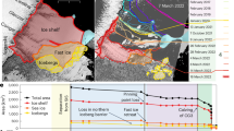 Satellite images (Figs. 1 and 2) are ASAR WSM imagery from ENVISAT, which operated from March 2002–April 2012. Owing to its all-weather, day–night imaging capability, ENVISAT ASAR WSM imagery is available in late autumn and winter, which covers the Wilkins and Voyeykov calving events. A basemap of Antarctica, its islands and the Voyeykov and Wilkins ice shelves was imported from the Making Earth System Data Records for Use in Research Environments (MEaSUREs) Antarctic Boundaries for International Polar Years 2007–2009 from Satellite Radar (Version 2)49. We edited the Wilkins shelf fronts in the MEaSUREs Antarctic Boundaries dataset to match the ENVISAT ASAR WSM imagery. As the Voyeykov is unconfined and terminates into a widespread mélange layer, we edited its shelf-front locations in the MEaSUREs Antarctic Boundaries dataset to match those given by ref. 9. Fracture locations were identified using a method previously applied to the Voyeykov9 and the George VI50. The method uses both ENVISAT ASAR WSM and Landsat-7 Enhanced Thematic Mapper Plus images, with fractures manually mapped in Quantum Geographic Information System (QGIS). For guidance, we used similar work undertaken to map fracture locations for the Wilkins from 1990–2008, using imagery from ENVISAT ASAR, the Advanced Land Orbit satellite and Terra Advanced Spaceborne Thermal Emission and Reflection Radiometer satellites7,31.