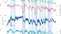 The abrupt onset of convection has a pronounced impact on climate at high southern latitudes (Fig. 3b), resulting in a large warming due to heat released from the deep ocean and consequent large retreat of sea ice (Figs. 2c and 3b). The increase in SO ventilation (Fig. 3f) resulting from the enhanced convection and the associated sea ice retreat brings large amounts of carbon that were stored in the deep ocean (Fig. 3h and Extended Data Fig. 2l) in contact with the atmosphere, leading to a rapid release of carbon (Fig. 3d) and a CO2 increase of ~15 ppm within a few centuries (Fig. 1l).