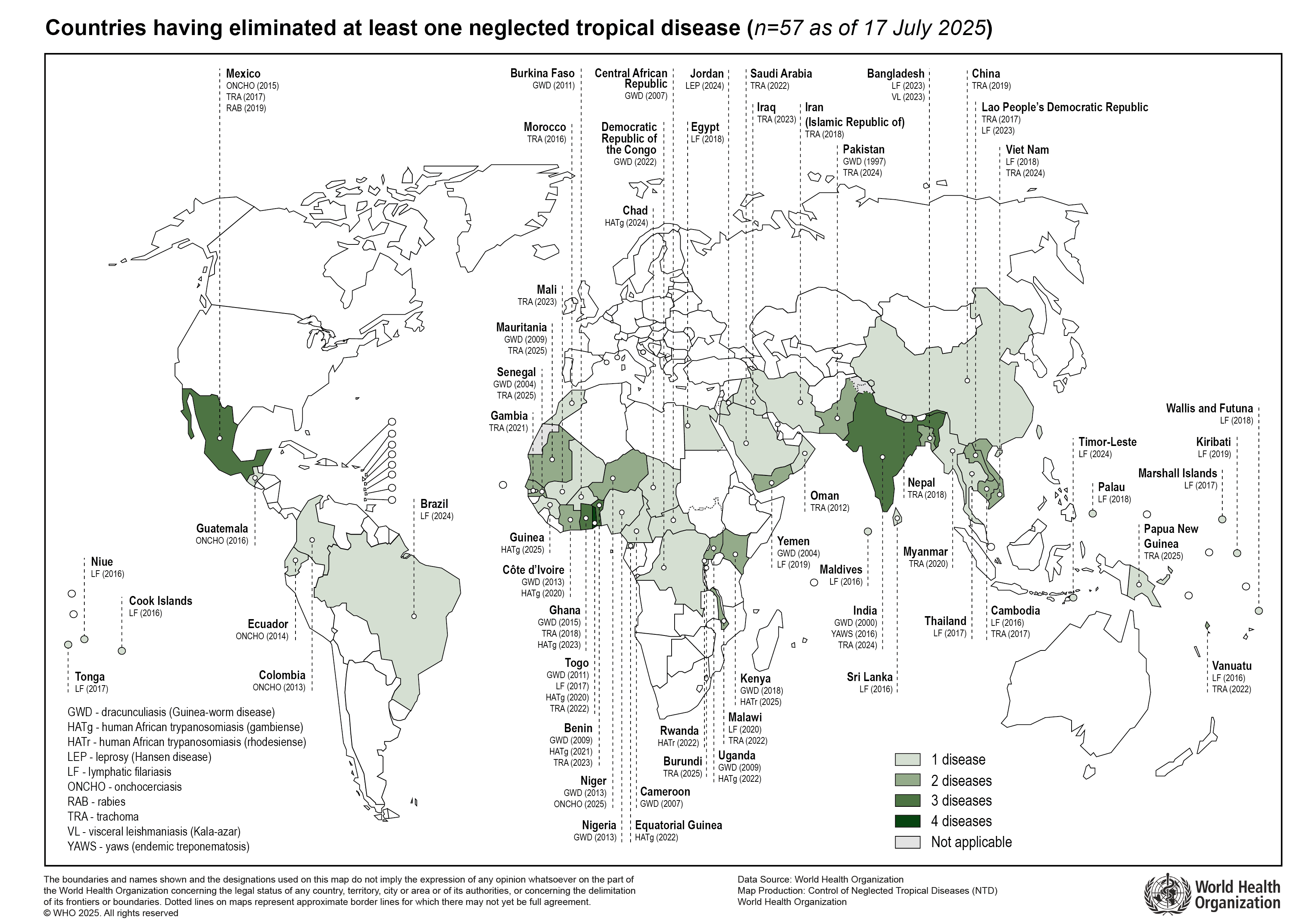 WHO. Countries having eliminated at least one neglected tropical disease. who.int https://www.who.int/images/default-source/maps/elimination_ntds.png?sfvrsn=bb12c410_10 (2025).