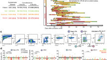 A CD154 assay and a cytokine-independent activation-induced marker assay (AIMs, OX40/CD25) were used to assess spike-specific (S1 and S2) circulating-TFH-cell responses after stimulation43,44. In brief, cryopreserved PBMCs were thawed and kept resting in complete RPMI 1640 medium in 5% CO2 at 37 °C overnight. Cells (1 × 106) were stimulated with SARS-CoV-2 spike protein (S1 + S2, 5 μg ml−1) or BSA (5 μg ml−1, Sigma-Aldrich) in 5% CO2 at 37 °C for 24 h. Concanavalin A (5 μg ml−1, Sigma-Aldrich) was used as a CD154 assay positive control, and staphylococcal enterotoxin B (1 μg ml−1, Toxin Technology) was used as the OX40/CD25 assay positive control. PBMCs from healthy controls were also stimulated in the same conditions. Furthermore, to test the spike-specific cytokine secretion of TFH cells, a conventional intracellular cytokine staining assay was used45,46. Intracellular secretion of IL-21 and IFNγ was measured after antigen stimulation of TFH cells. In brief, PBMCs were stimulated with SARS-CoV-2 spike protein (S1 + S2, 5 μg ml−1) or BSA (5 μg ml−1) in the presence of anti-CD28 (1 μg ml−1) and anti-CD49d (1 μg ml−1) (BioLegend) antibodies for 6 h, and brefeldin A (1:1,000, BioLegend) was added 1 h after stimulation. Anti-CD3 antibodies (1 μg ml−1, BioLegend) were included as a positive control. TFH cells were gated as live CD4+PD-1+CXCR5+ T cells. PE mouse anti-human CD154 (24-31), PE-Cy7 mouse anti-human OX40 (ACT35), APC-mouse anti-human IL-21 (3A3-N2), PE-Cy7 mouse anti-human IFNγ (4S.B3) (BioLegend) and PE-Cy5 mouse anti-human CD25 (M-A251) (BD Biosciences) were purchased.