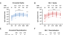 Antigen-specific CD4+ T cells were measured using the activation-induced markers (AIM) assay3,7,31. SARS-CoV-2-specific CD4+ T cells and CD8+ T cells were quantified as a percentage population of AIM+ (OX40+CD137+) CD4+ T cells and AIM+ (CD69+CD137+) CD8+ T cells, respectively, after stimulation of PBMCs with overlapping peptide megapools (MPs) at a concentration of 1 μg ml−1 in AIM-V media (Gibco) for 24 h at 37 °C. The MPs consist of 15-mer peptides overlapping by 10 amino acids covering the spike (S) or nucleocapsid protein (NP) of ancestral SARS-CoV-2 (B.1; GenBank: MN_908947) and MPs covering spike protein of VOCs Alpha (B.1.1.7; GISAID: EPI_ISL_601443), Beta (B.1.351; GISAID: EPI_ISL_660629) and Delta (B.1.617.2; GISAID: EPI_ISL_2020950). All peptides were synthetized as crude material (TC Peptide Lab), resuspended in DMSO, pooled and sequentially lyophilised as previously reported7,31. An equimolar concentration of DMSO was used as a negative control. Staphylococcal enterotoxin B at 0.1 µg ml−1 and CMV-specific MP were used as the positive stimulation control. After the stimulation period, for quantification of SARS-CoV-2-specific CD4+ T cells, PBMCs were washed with fluorescence-activated cell sorting (FACS) buffer (2% FBS in PBS) and surface stained with monoclonal antibody cocktail for 1 h at 4 °C in the dark: CD20, CD14, CD16, CD8a and fixable-viability dye coupled with APC eflour 780 in the dump channel, CD4−AlexaFluor 700 (RPA-T4), OX40−FITC (Ber-ACT35), CD137 PE Dazzle 594(4B4−1), CD45RA Brilliant Violet 785 (HI100) and CCR7 AlexaFluor 647 (G043H7). The cTfh cells were quantified by measuring the frequency of CXCR5+PD1+/− cells in the AIM+CD4+ T cells obtained after stimulation with spike and nucleoprotein MPs. The frequency of cTfh cells was expressed as the percentage of total CD4+ T cells. For cTfh analyses, in addition to the AIM markers, cells were also stained with CXCR5-Brilliant Violet 421 (J252D4), PD1-PE (EH12.2H7), CXCR3-Brilliant Violet 711 (G025H7) and CCR6-PE/Cy7 (G034E3). For quantification of SARS-CoV-2-specific CD8+ T cells, PBMCs were washed with FACS buffer and surface stained with monoclonal antibody cocktail for 1 h at 4 °C in the dark: CD20, CD14, CD16 and fixable-viability dye coupled with APC eflour 780 in the dump channel, CD4-AlexaFluor 700 (RPA-T4), CD8a-APC (RPA-T8), OX40−FITC (Ber-ACT35), CD137 PE Dazzle 594(4B4-1) and CD69 Brilliant Violet 510 (FN50). For all analyses, after staining, cells were washed and fixed with freshly prepared 1% paraformaldehyde (Sigma-Aldrich), followed by acquisition using BD LSRFortessa X-20 flow cytometer (BD Biosciences) and subsequent data analysis by FlowJo 10.7.1. The antigen-specific CD4+ T cells were measured as the data subtracted from DMSO conditions as the background. The positive response in the AIM assay was defined by setting up the limit of positivity above the median plus two times the standard deviation of negative controls (pre-pandemic PBMCs) stimulated with spike PeptideMP. The frequency of responders to SARS-CoV-2 spike PeptideMP stimulation was determined by applying Fisher’s exact test on the AIM+ and AIM− cells in DMSO- and PeptideMP-stimulated conditions.