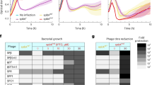 Overnight cultures were normalized to OD600 = 1.0 and then diluted 100-fold. Diluted cultures (150 µl) were dispensed in a flat-bottomed 96-well plate. Phage dilutions (10 µl) were added to each well such that the MOI varied from 50 to 0.005. Wells were then overlayed with 20 µl mineral oil, and plates were covered with a breathable membrane. Plates were incubated at 37 °C in a Biotek Synergy H1 microplate reader. OD600 was measured every 15 min. Three technical replicates were conducted for each strain.