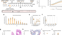 Organ samples from mice were either homogenized in 0.5 ml of RA1 lysis buffer supplemented with 1% β-mercaptoethanol and later used for RNA isolation, or in gentleMACS M-tubes containing 1 ml DMEM (Miltenyi Biotec) for the detection of infectious particles as previously described36. RNA was isolated using the NucleoMag Vet kit (Macherey Nagel). The RT–qPCR reaction was prepared using TaqPath 1-Step Multiplex Master Mix kit (Thermo Fisher) with primers and probes targeting the SARS-CoV-2 E gene, and was performed for 10 min at 45 °C for reverse transcription, 10 min at 95 °C for activation and 45 cycles of 15 s at 95 °C for denaturation, 30 s at 58 °C for annealing and 30 s at 72 °C for elongation. Fluorescence was measured during the annealing phase. RT–qPCRs were performed on a Bio-Rad real-time CFX96 detection system (Bio-Rad). The primers are listed in Supplementary Table 2. Infectious virus titres were determined by TCID50 measurement on Vero E6 cells and were calculated according to the Spearman–Kaerber formula.
