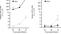 Next, we compared the levels of type-I interferon (IFN) response in hNECs infected with either the pre- or post-Omicron viruses. Overall, there was a clear correlation in hNECs between the levels of virus replication kinetics and the activation of type-I IFN response (Extended Data Figs. 6g,h, 7 and 8).