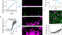 It has been observed that when bacteria are exposed to phages for extended periods16,17,18, mutants with increased biofilm formation are selected, because cells inside biofilms are often protected from phages due to limited mobility of phages into the biofilm and due to the obstruction of phage binding sites by the extracellular biofilm matrix10,19,20,21,22. Control experiments in which the biofilms that had formed after 8 h of phage exposure were broken up into individual cells showed that the bacterial population was as sensitive to phage exposure as cells that had not previously been exposed to phages (Extended Data Fig. 2a,b). Using the crystal violet assay for quantifying the biofilm formation of the cells obtained from biofilms formed after 8 h of phage exposure, we observed that these cells showed no significant difference in biofilm formation capability compared with the WT (Extended Data Fig. 2c). Together, these control experiments indicate that phage-resistant mutants and matrix hyper-producer mutants have not arisen or did not become a substantial fraction of the population during this relatively brief exposure to phages, suggesting that the increased 3D biofilm production during a few hours of phage exposure might be a regulatory response.