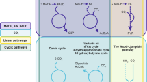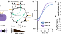Bacterial strains were streaked out on LB agar plates containing antibiotics when appropriate. Single clones were inoculated from the plate into 12-cm glass tubes containing 4 ml of M9 minimal medium supplemented with 80 mM formate and 100 mM HCO3 and cultivated at 10% CO2, 30 °C and 250 rpm. Growing cultures were then used to inoculate 50 ml of the same media in 250-ml flasks and cultivated in the same conditions. Pre-cultures were then used to inoculate 1:10 in M9 80 mM formate media and grown in batch at 30 °C and 400 rpm in 400 ml volume in 1 l DASGIP bioreactors (Eppendorf). The reactors were sparged at a constant flow of 60 sl h−1 (2.5 volume gas per volume culture per min) with a gas mixture of 10% CO2 and 90% air. Dissolved oxygen was measured online and was maintained above 30% via stirrer speed control (400–800 rpm).