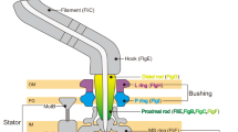 Bacterial flagella, helical propellers rotated by cell-envelope-embedded rotary motors, are icons of the evolution of molecular novelty6 (Fig. 1a). The flagellum, best studied in model organisms Salmonella enterica serovar Typhimurium and Escherichia coli, is composed of a ring of inner-membrane motor proteins (‘stator complexes’) that harness ion flux to rotate a large cytoplasmic rotor ring (the ‘C-ring’). Torque is transmitted through a chassis (the ‘MS-ring’) and periplasm-spanning axial driveshaft (the ‘rod’) to an extracellular propeller structure that generates thrust. Structures of the C-ring7,8,9, parts of stator complexes10,11, MS-ring and rod12,13, and axial structures14,15 have recently been determined from purified subcomplexes.