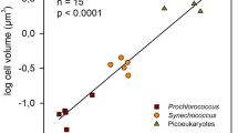 Raw data were processed to identify in-focus optimally positioned particles within the SeaFlow virtual core17. Optimally positioned particle analysis was performed using the R package Popcycle (version 4.7.3) available on GitHub. We defined five sets of gates based on forward light scatter, red fluorescence and orange fluorescence to identify 1-µm beads, Prochlorococcus, Synechococcus and small eukaryotic phytoplankton (<5 µm). Gate coordinates for each file were saved and stored in a structured query language (SQL) database. The equivalent spherical diameter (ESD) of each cell was estimated from forward scatter using the Mie light scatter theory. We then converted the ESD to carbon quotas using volume-to-carbon relationships for small phytoplankton17. Prochlorococcus size distributions were obtained by combining data collected every 3 min over each 1-h period (n = 12,814 hourly binned data points) to ensure robust statistical representation of the particle size distribution, with each hourly bin typically containing measurements from more than 10,000 individual cells.