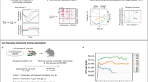 Two cohorts of ~8–10-week-old male C57Bl/6 germ-free mice were used in the experiments (BWH IACUC: 2016N000141). All mice were derived from our germ-free colony at the Massachusetts Host-Microbiome Center (MHMC) at Brigham and Women’s Hospital. Mice were singly housed in Optmice cages within the MHMC. The mice were given a faecal microbiota transplant (FMT) from either a healthy human stool donor (four mice) or from a human donor with ulcerative colitis (five mice) from an ongoing study at Brigham and Women’s Hospital (IRB: 2017P002420). Following the study protocol, samples were flash frozen without cryoprotectants and stored at −80 °C. Material for FMTs was prepared by thawing the stool samples and homogenizing in 5 ml of pre-reduced 1× phosphate buffered saline with 0.05% cysteine inside an anaerobic chamber. Germ-free mice were then orally gavaged with 200 µl of FMT material per mouse. Post gavage, mice were equilibrated for 3 weeks before beginning a series of three perturbations: high-fat diet (HFD), vancomycin and gentamicin (in that order). Each perturbation lasted for 1 week, followed by a 1-week normalization period off perturbations. Aside from the HFD perturbation, mice were maintained on standard MHMC gnotobiotic mouse chow (Autoclavable Mouse Breeder Diet 5021; LabDiet). For the HFD perturbation, Research Diets D12492 (60 kcal% of fat) was used. For the vancomycin perturbation, drinking water was replaced with water containing vancomycin at a concentration of 100 μg ml−1 and 3% sucralose (filter sterilized). For the gentamicin perturbation, drinking water was replaced with water containing gentamicin at a concentration of 4 μg ml−1 and 3% sucralose (filter sterilized). In all situations, mice were allowed to eat and drink ad libitum. Mouse faecal pellets were collected in triplicate on the basis of the sample collection timeline detailed in Fig. 2. We also obtained additional samples to generate data for fitting the d0 and d1 parameters in our amplicon sequencing measurement noise model. For this purpose, a total of 9 faecal pellets (3 pellets on each of the 3 consecutive days 8, 9, 10) were collected from mouse 2. Each faecal pellet was divided into two parts. This resulted in 18 samples that were then processed through the entire sequencing pipeline, from DNA extraction through sequencing. To collect faecal pellets, each mouse was removed from the Optimice cage and placed inside an autoclaved Nalgene cup. After pellets were produced, mice were returned to their cages and samples were collected from the cup with autoclaved forceps. Samples were placed in cryovial tubes and snap frozen in liquid nitrogen immediately, then stored at −80 °C. At the end of experiments, mice were euthanized by an overdose of inhaled vapours of isoflurane administered in an anaesthesia chamber, followed by cervical dislocation. These procedures are in accordance with the recommendations of the Panel on Euthanasia of the American Veterinary Medical Association.