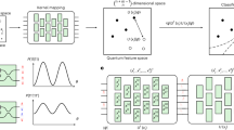 Finally, the addition operation, corresponding to the transformation |z1〉|z2〉→|z1 + z2〉, can be implemented with the interferometer shown in Fig. 2c. Two photons are injected in the interferometer, one for each mode pair (|0〉1, |1〉1) and (|0〉2, |1〉2). Two identical BSs are used to mix the mode pairs representing the same logical state for the two qubits, combining |0〉1 with |0〉2 and |1〉1 with |1〉2. After the mixing process, one output port of each BS is measured via the two detectors labelled as S and I (Fig. 2c), whereas a π/2 phase shift is added in mode |1〉o. Conditioned on the detection of a single photon in S, the output state is found to be \({\left\vert ({{\bf{z}}}_{{\bf{1}}}+{{\bf{z}}}_{{\bf{2}}})\sqrt{{\bf{RT}}}/({\bf{R}}-{\bf{T}})\right\rangle }_{\rm{o}}\), where R and T are the reflectivity and transmissivity of the BSs, respectively. If a single photon is detected at I instead, the corresponding output state is \({\left\vert -{{\bf{z}}}_{{\bf{1}}}{{\bf{z}}}_{{\bf{2}}}/({{\bf{z}}}_{{\bf{1}}}+{{\bf{z}}}_{{\bf{2}}})(\bf{R-T}\,)/\sqrt{\bf{RT}}\right\rangle }_{\rm{o}}\). The numerical multiplicative factor \(\sqrt{RT}/(R-T)\) can be set to 1 by choosing the reflectivity of both BSs to be \(R=\frac{5+\sqrt{5}}{10}\). For this choice of R, the output conditioned on a click in detector S is the sum state |z1 + z2〉o, whereas the one conditioned on a click in detector I is the harmonic mean state |–z1z2/(z1 + z2)〉o. The corresponding success probabilities are found to be