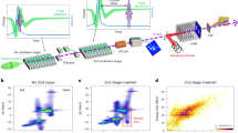 Experiments were conducted at the SASE2 undulator line of the European XFEL utilizing an electron beam with a charge of 250 pC and an energy of 16.2 GeV. Figure 2a,b shows 100 consecutive measurements and a single representative spectrum of XFEL pulses generated at 9 keV under standard SASE operation with a repetition rate of 10 Hz. Figure 2c shows the histogram of the number of spikes, which are computed based on 800 consecutive spectra. The spectrum of the standard SASE pulse typically has more than 20 spikes. The mean pulse energy of the pulses, as measured by the X-ray gas monitor, is 2,170 ± 84 μJ. Figure 2d,e shows the measured spectra when the phase and voltage of the high-harmonic rf structure are optimized for the self-chirping process while the arc remains unchanged. Most of the XFEL pulses generated after self-chirping exhibit four or five spikes in the spectrum, as shown in Fig. 2f, with a measured pulse energy of 124 ± 26 μJ. These results indicate a reduction in XFEL pulse duration following the optimization of the high-harmonic rf structure. After optimization of R56 of the arc (R56 = 260 μm), most of the spectra have one or two SASE spikes (Fig. 2g–i); 31% (37%) of the pulses exhibit a single-spike (two-spike) spectrum. The measured pulse energy of all events is 174 ± 23 μJ.