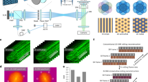 SIM achieves enhanced resolution through the application of a known sinusoidal illumination pattern, capturing modulated sample structures as moiré fringes. These fringes are then computationally processed to extract the super-resolution components and reassembled to produce images with improved resolution2,3. In the spatial frequency domain, this method involves convolving the illumination pattern’s optical transfer function (OTF), which consists of delta functions at frequencies present in that pattern, with the detection OTF. To achieve a twofold improvement in both the lateral and axial resolution, 3D-SIM uses three-beam interference12. However, owing to the need for sequential, plane-by-plane sample movement and imaging, 3D-SIM is slow, taking up to several seconds to capture images of a single volume. This hinders the observation of rapid biological processes in three dimensions and potentially introduces motion artefacts13,14.