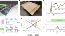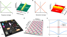 Our experiments are based on the propagation of light pulses in coupled optical fibre loops28,29,30. To obtain a one-dimensional photonic lattice, two optical fibre loops containing optical components are coupled by a variable beamsplitter (Agiltron). The chosen splitting ratio determines the coupling parameter β. The positions of the photonic lattice are encoded in pulse delays, and for this, the loops are chosen to have unequal optical path lengths. Here, the two roundtrip times are approximately 26,950 ns and 27,050 ns. The relative delay of 100 ns defines the width of a time bin in which the lattice positions x are encoded and, thus, approximately 270 positions can be encoded. Most of the propagation time in each loop is realized using spools of single-mode fibre (Corning Vascade LEAF EP). Each measurement starts by inserting a 50 ns pulse into the longer loop, that is, the loop that contains the spin-like components \({v}_{x}^{t}\) only, via a fibre-optical beamsplitter. The initial pulse is generated via intensity modulation of a continuous-wave distributed feedback laser (JDS Uniphase, 1,550 nm) with a Mach–Zehnder modulator (SDL Integrated Optics). To further increase the signal-to-noise ratio an acousto-optical amplitude modulator (Gooch & Housego) is used. During the propagation in the loop arrangement, light is periodically split up and combined at the variable beamsplitter leading to multi-path interference between the emerging subpulses. In each roundtrip (that is, time step t), part of the light is coupled out to photodetectors (Thorlabs), enabling a measurement of \({\left|{u}_{x}^{t}\right|}^{2}\) and \({\left|{v}_{x}^{t}\right|}^{2}\). The output voltages of the photodetectors are logarithmically amplified (FEMTO, HLVA100) and subsequently acquired using an oscilloscope (Rohde & Schwarz, RTO6). With the two propagation timescales, that is, the mean roundtrip time and the relative loop delay, it is possible to map the measured pulse intensity distribution onto a double-discrete (1 + 1)-dimensional photonic lattice. To realize the gain–loss modulation, in a first step, an acousto-optical amplitude modulator (Brimrose Corporation) is added to each loop. Then, in a second step, to also realize gain and to compensate for global losses (for example, insertion loss or propagation losses in the optical fibre), an erbium-doped fibre amplifier (Thorlabs) is added to each loop. The amplifiers are optically gain-clamped by a distributed feedback laser (JDS Uniphase, 1,538 nm) that is coupled to the amplifiers input via wavelength division multiplexing couplers (AC Photonics). This continuous-wave laser signal is removed directly after the amplification process by optical bandpass filters (WL Photonics), which also reduce the level of amplified spontaneous emission. Different photonic lattices are created by applying different modulations to the variable beamsplitter and the acousto-optical modulators. The required voltage signals are generated by arbitrary waveform generators (Keysight Technologies). All optical components are designed for operation at a wavelength of 1,550 nm and use standard single-mode fibre (Corning SMF28 or comparable). The optical polarization is aligned via manual polarization controllers (Thorlabs), for instance, before passing through polarization-sensitive components.