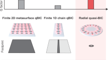 In this work, we reported the pioneering realization of a phonon-polariton-mediated qBIC metasurface. The qBIC nature was unequivocally assessed through comprehensive far- and near-field characterizations, supported by rigorous numerical simulations. By utilizing a low-loss polaritonic material, we achieved extreme miniaturization by shrinking the unit-cell size down to ~1.25 × 10−5 × \(\lambda_{0}^3\), where \(\lambda_{0}^3\) is the volume occupied by the free-space wavelength. This remarkable miniaturization led to the observation of a striking incident-angle-invariant behaviour on our metasurfaces, a highly unconventional characteristic for a symmetry-protected qBIC metasurface31,33. Using numerical simulations, we confirmed how this behaviour is a general feature of deeply subwavelength polaritonic metasurfaces, independent of the specific material or resonator geometry. This result paves the way for the utilization of phononic qBIC metasurfaces, and subwavelength polaritonic systems in general, in applications requiring consistent performances over a wide range of incidence angles such as in stealth technologies66 and omnidirectional radiative cooling67,68. We also showcase how the lack of angular dispersion allows us to perform surface-enhanced infrared absorption experiments with a standard off-axis Cassegrain objective without any degradation of the qBIC resonance quality. The strong electromagnetic confinement facilitated the emergence of vibrational strong coupling between a weak resonator (for example, PEG) and our qBIC system. Although phonon polariton vibrational strong coupling has been shown with hBN antennae obtained from exfoliated flakes50, here we report its realization in a large-area complementary-metal–oxide-semiconductor-compatible platform. The use of SiC is, therefore, suited for direct applications in surface-enhanced infrared absorption69,70 and nonlinear mid-IR optics71,72, as well as for the control of chemical reaction pathways through strong-coupling engineering73,74 at the nanoscale.