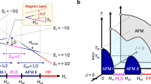 At zero field, the specific heat divided by temperature C/T shown in Fig. 2b exhibits a broad peak from a short-range 2D antiferromagnetic correlation around 1.2 K, followed by a tiny but sharp peak from the long-range 3D Néel ordering at Tc = 0.65 K, fully consistent with the previous studies27,30. Weak signature of the Néel order is also present in M(T), which is more clearly visualized in the temperature derivative dM/dT (Fig. 2e,f). Upon applying H, Tc first increases until Hp ≈ 2–3 T and then decreases to zero at the saturation field Hs = 5.93 T (refs. 27,30). This evolution is summarized in the phase diagram shown in Fig. 1c. The initial increase of Tc indicates the suppression of fluctuations along the field direction and the crossover of symmetry from Heisenberg-like to XY-like, as discussed in a class of low-dimensional Heisenberg magnets31,32. The suppression of fluctuations can indeed be captured by the initial decrease of the isothermal entropy up to Hp at temperatures below 0.8 K in Fig. 1b, as well as a negative slope dM/dT|H(= dS/dH|T) in the same H- and T-range in Fig. 2a,e.