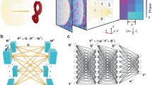 We initialize the system by making the neuron modes in the second and third layers resonant and add a small amount of disorder, that is, \({\varDelta }_{j}^{(n)}/\kappa ={w}_{\varDelta }({\xi }_{j}^{\;(n)}-1/2)\) with wΔ = 0.002 and ξ ∈ [0, 1). Similarly, we set the coupling rates to 2κ and add a small amount of disorder, that is, \({J}_{j,\ell }^{\;(n)}/\kappa =2+{w}_{J}{\xi }_{j,\ell }^{\;(n)}\) with wJ = 0.2. We empirically found that this initialization leads to the fastest convergence of the training. Furthermore, we scale our input images such that the background is off-resonant at Δ/κ = 5 and the numerals are resonant at Δ/κ = 0 (Fig. 2a) since, otherwise, the initial gradients are very small.