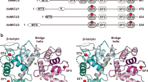 The sequences were aligned using PROMALS3D50 and numbered according to NfMCU. Secondary structures shown above the sequences are based on the cryo-EM structure of NfMCU. Loops are denoted by solid black lines; disordered regions not observed in the cryo-EM structure and truncations made to NfMCU are indicated by dashed lines. The first 75 residues in NfMCU (grey arrow) are predicted to be the mitochondrial targeting sequence (MTS). NCBI accession number for the sequences are: HsMCU (human MCU): NP_612366.1, MmMCU (mouse MCU): XP_006513531.1, DdMCU (D. discoideum MCU): XP_637750.1, CeMCU (C. elegans MCU): NP_500892.1, NcMCU (Neurospora crassa MCU): XP_959658.1, NfMCU (Neosartorya fischeri MCU): XP_001266985.1.