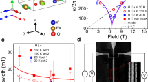 For the fits we use equation (6) and Sm ≈ S0, with Gm = Sn = 0, K/J = 0.025 and D/J = 0.011. a, b, Platinum wires along x. The fits correspond to Fig. 2. From fitting Rel in a, we obtain a value of G0 ≈ 0.17 mΩ. Here, fitting is done by excluding the largest three points of Rel (dotted lines), where the stochastic transport theory12 is expected to break down owing to strong magnon scattering processes. The main peak around the Hc corresponds to a reduction in the gap Δc of one magnon mode. In fitting b, we extract S0 ≈ 60.6 V A−2 from Rth induced by m. c, d, Platinum wires along y. The fits correspond to Fig. 3c. From fitting Rth in c, we extract S0 ≈ 64.3 V A−2, in agreement with the value from b. From fitting Rel in c, we obtain G0 ≈ 1.42 mΩ (contrary to the value for a). One explanation for this discrepancy could be a different spin-mixing conductance for this orientation, which would be consistent with the spin-mixing conductances extracted from the SMR data (Extended Data Figs. 4, 5). Our theoretical model in d introduces features not observed in the high-field experimental data; hence, we fit the data using G0 ≈ 1.42 mΩ from c. The pale blue dashed line indicates the theoretical features that were not observed in the experiment.