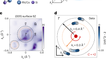 a, ARPES-measured Fermi surface and constant-binding-energy contours with an incident photon energy of 82 eV at 10 K. The BZ boundary is marked in blue. b, Three-dimensional bulk and two-dimensional surface BZ with higher-fold chiral fermions (±). The planes outlined in blue and the red cylinder are two-dimensional manifolds with indicated Chern number33 n. The cylinder enclosing the bulk chiral fermion at Γ has n = +2. c, Fermi arcs (orange) connect the projected chiral fermions. Energy dispersion cuts show that these two chiral edge modes are time-reversed partners propagating in opposite directions. d, Second-derivative Fermi surface with the straight and loop cuts of interest marked. e, ARPES spectrum along a loop \({\mathscr{M}}\), showing two right-moving chiral edge modes, suggesting that the fourfold chiral fermion at R carries Chern number −2. f, ARPES spectrum along cut I, showing a right-moving chiral edge mode. g, ARPES spectrum along cut II on the opposite side of the threefold chiral fermion at \(\bar{{\rm{\Gamma }}}\) (illustrated by the blue sphere), showing a left-moving chiral edge mode.