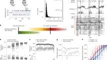 a, Psychometric curves for mouse Cori, showing the probability of choosing left (blue), right (orange) or NoGo (black) as a function of stimulus contrasts on the left and right screens. Each row corresponds to a pedestal contrast (the minimum contrast on the left and right screens). The horizontal axis encodes the relative contrast from the pedestal value, positive numbers indicating higher contrast on the right screen, and negative numbers for higher contrast on the left screen (for example, at pedestal = 50%, a ΔContrast of +50% corresponds to trials with 50% contrast on the left screen and 100% contrast on the right screen). Dots and vertical lines indicate the empirical fraction of choices made and 95% binomial confidence intervals for the fraction estimate, pooling data over sessions. Curves indicate the fit of a multinomial logistic model: \(\mathrm{ln}\,\frac{p(Left)}{p(NoGo)}={b}_{L}+{s}_{L}{c}_{L}^{n}\); \(\mathrm{ln}\,\frac{p(Right)}{p(NoGo)}={b}_{R}+{s}_{R}{c}_{R}^{n}\), in which cL and cR are the contrast on the left and right, and parameters bL, sL, n, bR and sR are fit by maximum likelihood estimation to the data for each subject3. b–j, As in a, for the remaining subjects. k, The model fit for all subjects overlaid, for left choices (blue) and right choices (orange), in both cases for pedestal = 0%. l, Summary of performance on high-contrast trials. Dots reflect the session-pooled proportion correct of each mouse for trials with 100% versus 0% contrast, with 95% binomial confidence interval. m, Example segment of wheel position data showing wheel movements detected as left turns (blue), right turns (orange) or incidental movements (black). Detected onsets (green circles) and offsets (red circles) marked for each movement. y-axis scale: distance moved at the circumference of the wheel (that is, 2πRθ, in which R is wheel radius and θ is its angular position). n, Wheel velocity trace for the same segment of data as in a. o, Example wheel turns aligned to the detected onset time. The dashed box indicates the region expanded in p. p, Example wheel turns aligned to detected onset time, zoomed to show the moment of takeoff, illustrating that the wheel had moved by less than 0.5 mm by onset. The step-like appearance of the trace reflects the resolution of the rotary encoder (each step unit is 0.135 mm at the surface of the wheel). q, Decoding the eventual direction of the wheel movement using the instantaneous velocity at different times relative to detected movement onset reveals that the direction only starts to be decodable around 20 ms before detected onset, and is not reliably (>80%) decoded until the time of onset. Error bars represent s.d. across sessions (n = 39).