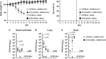 Total RNA was extracted from tissues homogenates of organs using the RNeasy Mini Kit (Qiagen), and reverse transcription was performed using the PrimerScript RT Reagent Kit (TaKaRa) following the manufacturers’ instructions. RT–qPCR reactions were performed using the PowerUp SYBG Green Master Mix Kit (Applied Biosystems), in which samples were processed in duplicate using the following cycling protocol: 50 °C for 2 min, 95 °C for 2 min, followed by 40 cycles at 95 °C for 15 s and 60 °C for 30 s, and then 95 °C for 15 s, 60 °C for 1 min, 95 °C for 45 s. The primer sequences used for RT–qPCR are targeted against the envelope (E) gene of SARS-CoV-2 and are as follows: forward: 5′-TCGTTTCGGAAGAGACAGGT-3′, reverse: 5′-GCGCAGTAAGGATGGCTAGT-3′. The PCR products were verified by sequencing using the dideoxy method on an ABI 3730 DNA sequencer (Applied Biosystems). During the sequencing process, amplification was performed using specific primers. The sequences for this process are available upon request to the corresponding author. The sequencing reads obtained were linked using DNAMAN, and the results were compared using the Megalign module in the DNAStar software package. The SYBR green real-time PCR standard curve was generated by serial tenfold dilutions of recombinant plasmid with a known copy number (from 1.47 × 109 to 1.47 × 101 copies per μl). These dilutions were tested and used as quantification standards to construct the standard curve by plotting the plasmid copy number against the corresponding threshold cycle values (Ct). Results were expressed as log10-transformed numbers of genome equivalent copies per ml of sample.