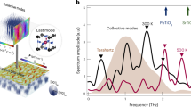 a, 3D schematic of diffraction peaks of the film around the 023 or 113 substrate peaks in reciprocal space. The dashed arrows indicate the reciprocal axes through the centres of the FE or vortex SL peaks that are offset along the qy-axis owing to the lattice constant difference along the y-axis. Only two SL and their satellite peaks are shown for simplicity. b, Normalized change of diffraction intensity of the 113 FE satellite peak (red curve) measured at the delay of 4 ps indicated by the red arrow in e, and normalized change of diffraction intensity of the 004 FE SL peak (blue curve) measured at the delay of 35 ps indicated by the blue arrow in g, as a function of the applied THz peak field. Lines are linear and quadratic fits to the measured data, in agreement with the field-driven structure factor modulation and the THz-induced Bragg peak shift (heating), respectively. c, Rocking curve of 023 FE SL peak. d, Normalized change of diffraction intensity as a function of delay measured at various incident angles indicated by the magenta, grey and blue arrows in c. e, Normalized change of diffraction intensity of the 113 FE SL peak and its satellites as a function of delay. The curves are vertically offset for clarity. f, Fourier spectra of e. g, Normalized change of diffraction intensity as a function of delay measured at the lower-angle side of the 004 FE SL peaks, indicated by the green arrow in h. h, Rocking curves of 004 FE SL peak measured at the delay of 35 ps with and without THz excitation. The peak shift shows a strain of 2.5 × 10−5, corresponding to a 2 K temperature rise as calibrated by the temperature-dependent X-ray diffraction measurements shown in Extended Data Fig. 7b.