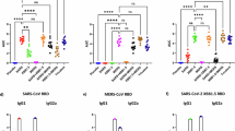 Rhesus and cynomolgus macaques were housed and treated in Association for Assessment and Accreditation of Laboratory Animal Care (AAALAC)-accredited institutions. The study protocol and all veterinarian procedures were approved by the Bioqual IACUC per a memorandum of understanding with the Duke IACUC, and were performed based on standard operating procedures. Macaques studied were housed and maintained in an AAALAC-accredited institution in accordance with the principles of the NIH. All studies were carried out in strict accordance with the recommendations in the Guide for the Care and Use of Laboratory Animals of the NIH in BIOQUAL. BIOQUAL is fully accredited by AAALAC and through OLAW, assurance number A-3086. All physical procedures associated with this work were done under anaesthesia to minimize pain and distress, in accordance with the recommendations of the Weatherall report ‘The use of non-human primates in research.’ Teklad 5038 primate diet was provided once daily by macaque size and weight. The diet was supplemented with fresh fruit and vegetables. Fresh water was given ad libitum. All macaques were maintained in accordance with the Guide for the Care and Use of Laboratory Animals. mRNA-LNP was prepared as previously stated51,52. Rhesus macaques (n = 8 macaques) were immunized intramuscularly twice with 50 μg of RBD mRNA-LNP. Cynomolgus macaques (n = 5 macaques) were immunized twice with 50 μg of S-2P mRNA-LNP (encoding the transmembrane spike protein stabilized with K986P and V987P mutations) and boosted once with 100 μg of RBD–scNP adjuvanted with 5 μg of 3M-052 aqueous formulation admixed with 500 μg of alum in PBS. An additional group of cynomolgus macaques (n = 5 macaques) were immunized in the right and left quadriceps with 100 μg of RBD–scNP adjuvanted with 5 μg of 3M-052 aqueous formulation admixed with 500 μg of Alum in PBS31. The mixture for immunization consisted of 250 μl of RBD–scNP mixed with 250 μl of 0.02 mg ml−1 3M-052 and 2 mg ml−1 alum. Group sizes were selected such that statistical significance could be reached with between group nonparametric statistical comparisons. No other statistical methods were used to predetermine sample size. Macaques were on average 8 or 9 years old and ranged from 2.75 to 8 kg in body weight. Male and female macaques per group were balanced when availability permitted. Studies were performed unblinded. Macaques were evaluated by Bioqual veterinary staff before, during and after immunizations. In the macaques studied, complete blood counts and chemistries were obtained throughout the immunization regimen and no marked abnormalities were noted. Of the 10 cynomolgus macaques, there were no adverse events reported at injection sites. Over the course of the study, two cynomolgus macaques experienced slight weight loss. Two cynomolgus macaques showed a single incidence of poor appetite, with one additional cynomolgus macaque showing poor appetite intermittently throughout the study. Additionally, one macaque presented with an infected lymph node biopsy site that responded to appropriate veterinary treatment. Biospecimens were collected before challenge, and 2 and 4 days after challenge, as previously described15. Human samples were obtained with informed consent. All recruitment, sample collection and experimental procedures using human samples have been approved by the Duke Institutional Review Board.