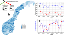 To evaluate the epidemiological impact of the app, we first used a modelling approach. We estimated the number of cases averted with a model linking the number of notifications, the probability that notified individuals had COVID-19, the timing of notification relative to transmission, and the adherence to quarantine. Adherence to quarantine is critical but difficult to assess reliably. UK surveys found that only 11% of individuals in quarantine declared proper adherence to quarantine rules, but 65% of individuals intended to adhere to quarantine13, albeit imperfectly. Recent surveys found a high adherence to quarantine (greater than 80%)14, and this behaviour may be more representative of app users. We considered an intermediate scenario corresponding to 61% overall effectiveness of quarantine in preventing transmissions as our central estimate, leading to 284,000 cases averted. The estimated number of cases averted was higher in areas of high app uptake (Fig. 2). The slope of the regression in Fig. 2b indicates that the fraction of cases averted (among all cases observed or averted) increased by 0.8% for 1% increase in app uptake (Table 1).