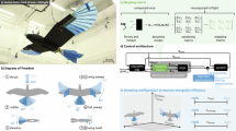 Although the full bird’s centre of gravity defines its symmetric flight dynamics, the wing-only parameters can give insight into asymmetric configurations. We found that the elbow and wrist ROM caused the centre of gravity of the wing to shift along the y axis (\(\triangle {y}_{{\bar{{\rm{C}}}{\rm{G}}}_{{\rm{w}}{\rm{i}}{\rm{n}}{\rm{g}}}}\), normalized by the maximum half span) by between 10% (black swift (Cypseloides niger)) and 27% (American white pelican (Pelecanus erythrorhynchos)) (Fig. 2c), where the most distal \({y}_{{\bar{{\rm{C}}}{\rm{G}}}_{{\rm{w}}{\rm{i}}{\rm{n}}{\rm{g}}}}\) was 28% (western grebe (Aechmophorus occidentalis)). Additionally, \(\triangle {y}_{{\bar{{\rm{C}}}{\rm{G}}}_{{\rm{w}}{\rm{i}}{\rm{n}}{\rm{g}}}}\) was positively associated with the arm-to-hand wing ratio (Extended Data Table 1), such that birds with longer hand wings than arm wings (like the swift) would have a reduced capacity to shift the wing’s centre of gravity. The centre of gravity shift was largely driven by elbow extension (P < 0.001, partial η2 > 0.51; Fig. 2e) whereas the effect of the wrist varied across species. These results highlight a well-conserved proximal location of the wing centre of gravity across species. Contrary to a previous study25, we did not find that the log-transformed mean \({y}_{{\bar{{\rm{C}}}{\rm{G}}}_{{\rm{w}}{\rm{i}}{\rm{n}}{\rm{g}}}}\) differed from isometric expectations (Fig. 2g, Extended Data Table 1).