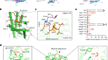 In contrast to the extensive interactions contributed by the stalk-N, the stalk-C region (Q552–L558 in ADGRD1, S574–P578 in ADGRF1) forms only limited contacts with the TMD. However, introducing an alanine mutation in this region markedly impaired the receptor basal activity (Fig. 2i, j, Extended Data Table 2). This aligns well with previous investigations of synthetic stalk peptides of several aGPCRs, showing that long peptides with lengths of 12–20 residues exhibit the highest potencies in inducing receptor activation8,9,29,30. These data suggest that although the stalk-N confers the agonistic activity, the stalk-C is required for full activity. In the ADGRD1 and ADGRF1 structures, the stalk-C adopts an extended conformation that runs across the helical bundle and packs tightly with the stalk-N, ECL2 and the third extracellular loop (ECL3), largely covering the entrance to the TMD binding pocket. Furthermore, the stalk-C introduces a turn element in the middle of the stalk, which allows the N-terminal tail to bind intramolecularly back toward the binding site. Thus, the requirement of the stalk-C for receptor activation is most likely to result from its contribution to the proper folding of the stalk and stabilization of the stalk-N conformation, which ensure the correct positioning and recognition of the agonistic core sequence in the TMD.