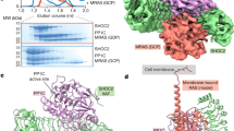 As a prelude to the structural analysis, we studied the assembly of the ternary SHOC2 complex from its constituent components. We individually expressed and purified recombinant SHOC2 (residues 80–582, corresponding to the conserved LRR domain), MRAS (residues 1–178) and PP1Cα (residues 7–300) and studied their interactions using surface plasmon resonance (SPR). To evaluate its pairwise interactions, we immobilized MRAS (loaded with either GDP or the non-hydrolysable GTP analogue GppNHp) and performed SPR analysis using SHOC2 or PP1Cα as the analyte. Whereas SHOC2 bound to MRAS in a concentration- and nucleotide-dependent manner, PP1Cα did not, even at high micromolar concentrations (SHOC2, dissociation constant (KD) = 6.12 µM; PP1Cα, KD, no binding; Fig. 1a and Extended Data Fig. 1a,b). We were also unable to detect binding of PP1Cα to immobilized SHOC2 (Extended Data Fig. 1c), indicating that PP1Cα does not form individual binary complexes with MRAS or SHOC2 under these conditions. Notably, the affinity of SHOC2 for immobilized MRAS was increased 70-fold in the presence of an excess of PP1Cα. These findings suggest that PP1Cα requires the simultaneous presence of MRAS and SHOC2 to participate in the ternary complex, whereas SHOC2 and MRAS can form a weaker, independent binary complex. The strong positive cooperativity for SHOC2–MRAS binding in the presence of PP1Cα indicates that the ternary complex involves reciprocal interactions among the component proteins, rather than independent scaffolding of MRAS and PP1C by SHOC2.