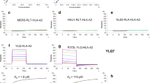 The four SARS-CoV-2 peptides (Fig. 1a–c and Supplementary Table 17) were synthesized by in vitro transcription and translation of oligonucleotides encoding each peptide using the PURExpress in vitro protein synthesis kit (New England BioLabs) as previously described56. Peptides NQK-Q8 (NQKLIANQF) and NKQ-A8 (NQKLIANAF) (used in Figs. 1d and 2–4) were synthesized using the fluoren-9-ylmethoxycarbonyl (Fmoc) method of solid-phase peptide synthesis. The process was performed using the Biotage Initiator+ Alstra automated peptide synthesizer and Wang resin (100–200 mesh, 1.24 mmol g−1), which was swollen in dimethylformamide (DMF) for 2 h before use. The Fmoc-amino acids and HCTU/HOBt/DIPEA (4 eq.) dissolved in DMF were then added sequentially to the resin and the coupling reactions were carried out with microwave heating at 60 °C for 20 min. The Fmoc protecting groups were removed using piperidine (20% in DMF) at room temperature for 20 min. The peptides were cleaved from the resin using a mixture of 95% trifluoroacetic acid (TFA) and 5% triisopropylsilane (TIPS) for 3 h. After evaporation of the TFA/TIPS mixture and precipitation with diethylether, the crude peptides were purified using reversed-phase high-performance liquid chromatography (HPLC) on the Shimadzu HPLC system fitted with two Shimadzu LC-20AD pumps, a SIL-20AHT autosampler, SPD-M20A photodiode array detector and a FRC-10A fraction collector and an Onyx Monolithic C18, 100 × 10 mm semipreparative column with a solvent system consisting of 0.1% TFA in water and acetonitrile over 30 min. The purified peptides were lyophilized and stored at −20 °C. The purity was confirmed to be >95% in each case by analytical HPLC and the structures were confirmed using high-resolution electrospray ionization mass spectrometry (Supplementary Fig. 11).