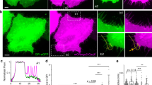 Image reconstruction was performed using PeakSelector (G. Shtengel and H. Hess, Howard Hughes Medical Institute, https://github.com/gleb-shtengel/PeakSelector) as previously described26. Gold nanoparticles embedded in the coverslip were used as fiducial markers to calibrate, align and transform overlaid frames into a single 3D image. Localizations with estimated x/y uncertainty of more than 0.06 pixels (or nanometre equivalent) were filtered out of the data. Only localizations that were less than 150 nm of the coverslip fiducials were included to isolate those found at or near the plasma membrane. Localizations were exported from PeakSelector as an ASCII file, and total raw localization data were exported as a TIFF file. Custom MATLAB software was used to remove fiducial bead localizations by identifying beads in the total raw data image and eliminating corresponding bead localizations in the ASCII file (Extended Data Fig. 4b).