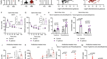 We followed the SCFA extraction and GC–MS/MS measurement methods as previously described47 with some modifications. A 90 μl aliquot of plasma was added to 10 μl Milli-Q water containing internal standards (2 mM [1,2-13C2]acetate, 2 mM [2H7]butyrate and 2 mM crotonate). For faecal samples, a 25 μl aliquot of methanol extract was added to 10 μl Milli-Q water containing internal standards and then centrifugally concentrated at 40 °C and reconstituted with 100 μl of Milli-Q water. Then, 50 μl of hydrochloric acid (HCl) and 200 μl of diethyl ether were added to the solution and mixed well. After centrifugation at 3,000g for 10 min, 80 μl of the organic layer was transferred to a glass vial and 16 μl N-tert-butyldimethylsilyl-N-trifluoroacetamide (MTBSTFA, Sigma-Aldrich) was added to derivatize the samples. The vials were incubated at 80 °C for 20 min and allowed to stand for 48 h before injection. The analysis was performed using a Shimadzu GCMS-TQ8030 triple quadrupole mass spectrometer with a capillary column (BPX5). The GC oven was programmed as follows: 60 °C held for 3 min, increased to 130 °C (8 °C min−1), increased to 330 °C (30 °C min−1) and finally 330 °C held for 3 min. The detector and injector temperatures were 230 °C and 250 °C, respectively. GC was operated in constant linear velocity mode set to 40 cm s−1. Injection volume was set at 1 μl with a split ratio of 1:30. The data were processed and concentration was calculated by LabSolutions Insight (Shimadzu).