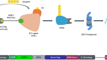 Reactions were performed using the iTaq Universal Probes One Step kit (Bio-Rad, 1725141) in biological and technical triplicates using RNA samples stored at −80 °C before use. A multiplexing protocol was used and TaqMan probes used for RT–qPCR analysis were ordered from iDT (https://eu.idtdna.com/) as predesigned PrimeTime qPCR Probe assays, labelled FAM/ZEN/IBFQ for all except for housekeeping gene ACTB TET/ZEN/IBFQ (Supplementary Table 3). In brief, 2 µl of RNA normalized at 10 ng µl−1 in ultrapure water (Invitrogen, 10977-035) was mixed with 8 µl of 2× master mix made as follows: iTaq mix 5 µl, 0.25 µl iScript RT, 0.25 µl TaqMan probe for gene of interest 40×, 0.25 µl TaqMan probe for control gene and 2 µl ultrapure water. The protocol for the 7900HT Device (Applied Biosystem) includes a 10 min step at 50 °C; 3 min inactivation at 95 °C; 40 cycles of denaturation of 10 s at 95 °C and 30 s hybridization/elongation step at 60 °C. The relative levels of mRNA expression were calculated according to the ΔΔCt method49 and individual expression data were normalized to ACTB. WRN endogenous versus WRN exogenous K577A mutant mRNA were measured by SYBR green. After isolation of RNA as described above, RT was performed with an initial amount of 250 ng of RNA using the High-Capacity cDNA Reverse Transcription Kit (Applied Biosystems, 4368813). The qPCR reaction was performed using SYBR green (Applied Biosystem, 4367659) mixed with 5 ng of cDNA and primer pairs (WRNendogenous forward: GTCATGGCAACTGGATATGGA, WRNendogenous reverse: CTGGAGCAGGCCCATGTTAC, WRNK577A forward: AGGAAAGACGGGACAACGTC, WRNK577Areverse: CGTCGACGGCAATCAGAGTA) according to the supplier recommendations. The qPCR reaction and dissociation curve have been run on an Applied Biosystem 7900HT device. Software for analysis is SDS2.4.1, thresholds for calculation were manually adjusted and the resulting data were analysed using the ΔCt method: for each sample, three replicates were performed for each gene of interest (as well as for the reference gene (human ACTB). The mean and s.d. were calculated for each group of triplicates. The ΔCt for each sample was calculated as the difference between the Ct of the gene of interest and the reference gene for a given sample. The s.d. of this difference equals the square root of the sum of the squared s.d. of the individual mean Ct. The ΔΔCt is the difference between the ΔCt of the sample of interest (for example, treated) and the ΔCt of the reference samples (vehicle-treated sample). Same as seen previously, the s.d. of this difference equals the square root of the sum of the squared s.d. of the individual ΔCt. Differential expression is calculated as \({2}^{-\Delta \Delta {C}_{{\rm{t}}}}\) for each sample. The error of the \({2}^{-\Delta \Delta {C}_{{\rm{t}}}}\) is calculated as a range depending on the s.d. of the ΔΔCtterm (2(x) is a strictly positive, growing function but nonlinear). The results were then normalized setting the mean vehicle value to 1.0 or 100% for each gene of interest.