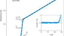 a, Field dependences of electrical resistance at 57.3 GPa for sample S1. b, Field dependences of electrical resistance at 61.0 GPa for sample S2. c, Field dependences of electrical resistance at 69.0 GPa for sample S2. The green dashed lines depict the linear fit of the normal state resistances. d, The Ginzburg–Landau fittings of the upper critical fields at 57.3 (S1) and 69.0 GPa (S2). The magnetic fields are applied perpendicular to the ab plane.