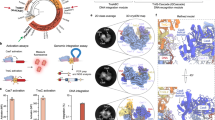 The IS621 recombinase gene was cloned into a modified pFastBac1 expression vector (Thermo Fisher Scientific), which encodes an N-terminal His8 tag, a Twin-Strep tag and a human rhinovirus 3C protease cleavage site (Supplementary Table 1). The IS621 protein was expressed in Sf9 cells (Thermo Fisher Scientific), using the Bac-to-Bac baculovirus expression system (Thermo Fisher Scientific). Sf9 cells were cultured in Sf900II medium (Thermo Fisher Scientific), infected with the recombinant baculovirus at a density of approximately 2 × 106 cells per millilitre, and then incubated at 27 °C for 48 h. The cells were collected by centrifugation at 5,000g and stored at −80 °C before use. The Sf9 cells were lysed by sonication in lysis buffer (20 mM Tris-HCl (pH 7.5), 1 M NaCl, 2 mM MgCl2, 2% Triton X-100 and protease inhibitor cocktail), and the lysate was clarified by centrifugation at 40,000g. The supernatant was mixed with Strep-Tactin XT resin (IBA) at 4 °C for 1 h. The resin was washed with wash buffer (20 mM Tris-HCl (pH 7.5), 500 mM NaCl, 2 mM MgCl2, 3 mM 2-mercaptoethanol and 10% glycerol), and the protein was eluted with wash buffer containing 80 mM biotin. The eluted protein was purified by size-exclusion chromatography on a Superdex 200 Increase 10/300 GL column (Cytiva), equilibrated with buffer (20 mM Tris-HCl (pH 7.5), 500 mM NaCl, 1 mM dithiothreitol (DTT), 10% glycerol and 2 mM MgCl2). The peak fractions were collected and stored at −80 °C until use. The S241A and D11A/E60A/D102A/D105A mutants were similarly expressed and purified. The bRNAs were transcribed in vitro with T7 RNA polymerase and purified by 10% denaturing (7 M urea) PAGE (Supplementary Table 1).
