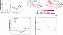 The research carried out at the Jet Propulsion Laboratory, California Institute of Technology, was under a contract with the National Aeronautics and Space Administration. Resources supporting this work were provided by the NASA High-End Computing programme through the NASA Advanced Supercomputing Division at Ames Research Center. Authors B.B., A.C., J.L. and K.B. acknowledge the support from NASA Orbiting Carbon Observatory Science Team Program and the Carbon Monitoring System Program (grant no. NNH20ZDA001N-CMS). We acknowledge the World Climate Research Programme, which, through its Working Group on Coupled Modelling, coordinated and promoted CMIP6. We thank the climate modelling groups for producing and making available their model output, the Earth System Grid Federation (ESGF) for archiving the data and providing access and the many funding agencies who support CMIP6 and ESGF. GFAS is generated using Copernicus Atmosphere Monitoring Service Information 2020; neither the European Commission nor ECMWF is responsible for any use that may be made of the information it contains. The East Trout Lake TCCON station is funded through an infrastructure grant from the Canada Foundation for Innovation (grant no. 35278) and the Ontario Research Fund (grant no. 35278). The Park Falls TCCON site was supported by NASA (grant no. 80NSSC22K1066). We thank J. L. Laughner for guidance with the TCCON data. We thank M. Hafer and A. Dyk for providing information on Canada’s managed land. And we thank L. Baskaran for help in rasterizing these data.