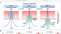 We grew 200-nm-thick epitaxial NNO films on the (111)-oriented Nb-doped STO (Nb-STO) single crystal substrates (Methods and Supplementary Fig. 2). Using the synchrotron-based X-ray diffraction (XRD), the NNO N and P phases show the (444)R and (048)O diffraction peaks (both are (222) in pseudocubic notation) around the (222) diffraction peak of the substrate (Supplementary Fig. 3). The pseudocubic coordinate system is used in the following discussions. We performed the reciprocal space mappings (RSMs) of the NNO/Nb-STO heterostructure (Fig. 2a). The (113) RSM indicates that N and P phases are epitaxially grown on the substrate in a coherently strained state. Combining with the other two independent RSMs of the (222) and (312) planes (Extended Data Fig. 2), these two phases show a rhombohedral and orthorhombic symmetry, respectively. The calculated lattice parameters are apc,N = 3.919 Å for the N phase and apc,P = 3.898 Å for the P phase using the reciprocal space vector method42. The N phase has a R3c structure and the P phase has a structure of Pbcm based on our diffraction data, consistent with previous studies36,43. Moreover, the estimated ratio of the N phase and P phase is about 1:3 (Supplementary Fig. 4). We conducted the XRD φ (Phi)-scans for the (113) peak of Nb-STO, NNO N and P phases to confirm the epitaxial relationship (Fig. 2b). The result shows the global three-fold symmetry of both N and P phases. Furthermore, our half-order diffraction scan results show that the sample contains all types of oxygen octahedral rotation behaviour (that is, \({a}^{\pm }{b}^{\pm }{c}^{\pm }\)) in Glazer’s notations (Extended Data Fig. 3), suggesting that the three-fold symmetry of the orthorhombic phase may be attributed to the arrangement of the structural domains. Figure 2c shows the XRD line scans of the quarter diffraction peaks of the P phase along the (H 1 1), (1 K 1) and (1 1 L). The appearance of (7/4 1 1), (1 7/4 1) and (1 1 7/4) diffraction peaks along three mutual orthogonal scans confirms the three-fold symmetry of arrangements of the P phase. Besides, the similar diffraction intensity of these quarter peaks implies that the domains have almost equal distribution along three directions. The quarter diffractions resulting from the antipolar displacement in the P phase and the three-fold symmetry caused by the P phase arrangement are also confirmed by RSMs (Extended Data Fig. 4). We scanned the surface morphology of the NNO film using an atomic force microscopy (AFM) (Fig. 2d). The NNO P phase (bright contrast) shows an accurate 120° angle relationship of domains from the top view, matching with the three-fold symmetry from the XRD data. It also indicates that the N phase (dark contrast) sits in between the P phase domains. Furthermore, the film has a smooth surface with a clear unit-cell terrace structure over an area of 1 × 1 μm2 and a root-mean-square (RMS) roughness of ~ 300 pm as shown in Fig. 2d (inset), indicating a high film quality.